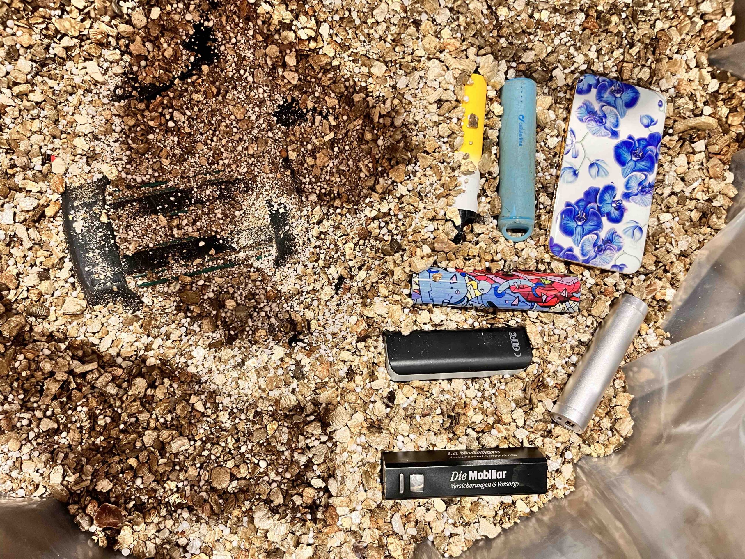 Wie ihr auf den Bildern sehen könnt, bewahren wir die Lithiumbatterien in einem sicheren Behälter auf und «ersticken» die Gefahren mit einem Streu aus Vermiculit, einer mineralischen Masse, die isolierend in der Gemüseindustrie oder als saugfähiger Streu in der Tierhaltung verwendet wird. Diese unbrennbare Füllmasse schützt vor mechanischen Stössen und absorbiert Gefahrenflüssigkeiten.